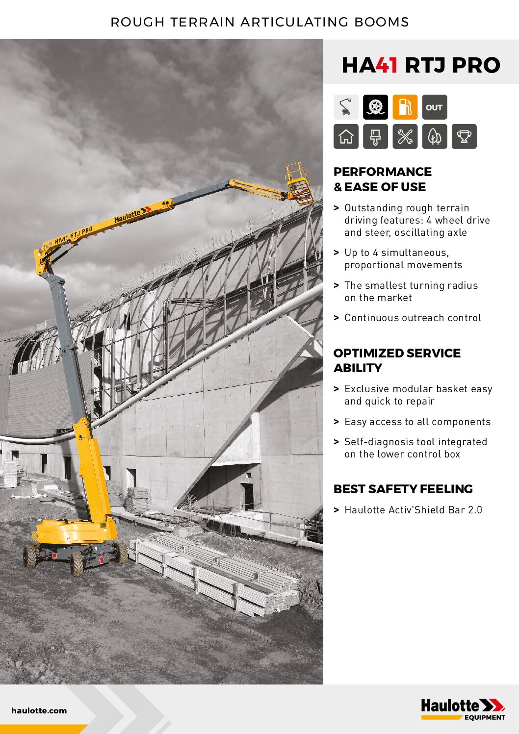 The HA41 RTJ PRO is equipped with an advanced oscillating axle that automatically adapts to uneven terrain, ensuring all wheels maintain constant ground contact for superior stability, traction, and operator safety.