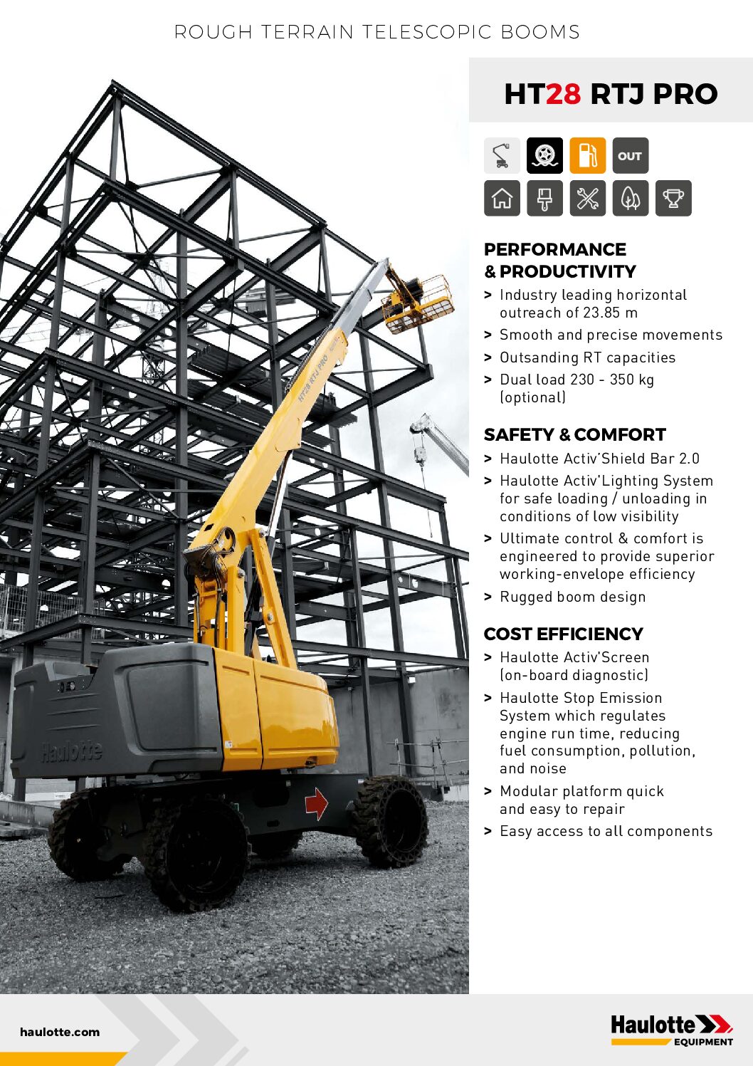 With its robust design, rough-terrain capability, and Haulotte’s advanced safety features, the HT28 RTJ PRO is ideally suited for large-scale construction, industrial maintenance, and infrastructure projects requiring both height and high performance.