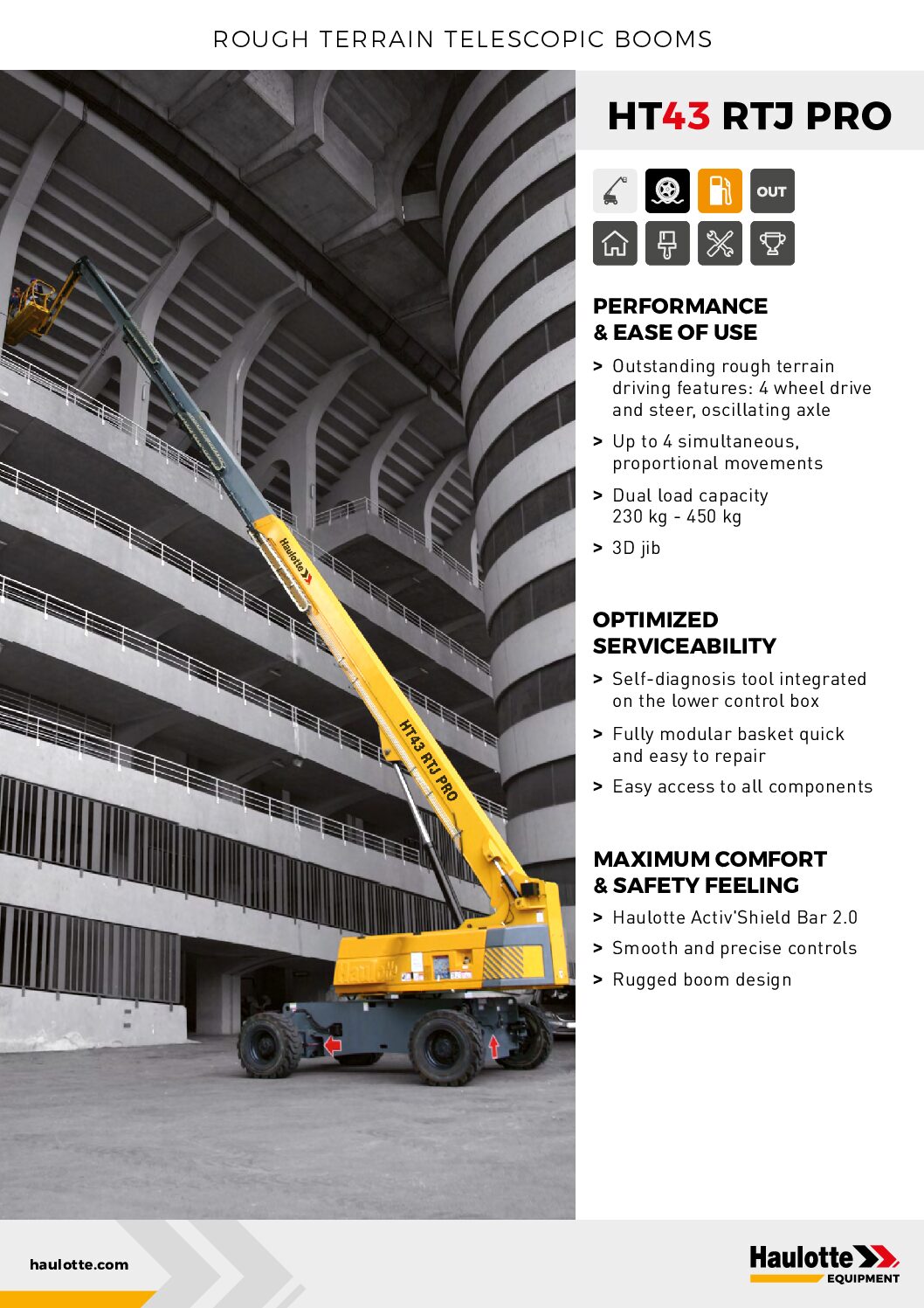 The HT43 RTJ PRO telescopic boom lift is purpose-built to perform in the most restrictive environments and tackle the most demanding projects. Incorporating Haulotte’s latest innovations, it offers one of the safest and most reliable solutions for working at heights, while boosting productivity on construction sites and maximizing machine uptime.